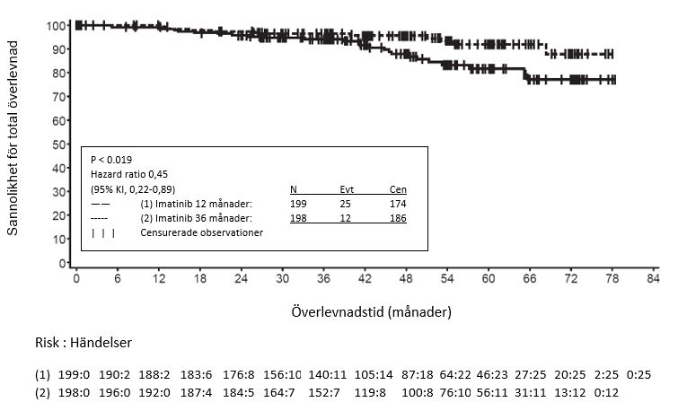 Dessutom förlängde 36-månaders behandling med imatinib signifikant den totala överlevnaden (OS) jämfört med 12-månaders behandling med imatinib (HR = 0,45 [0,22-0,89], p=0,0187) (Tabell 8, Figur 2).