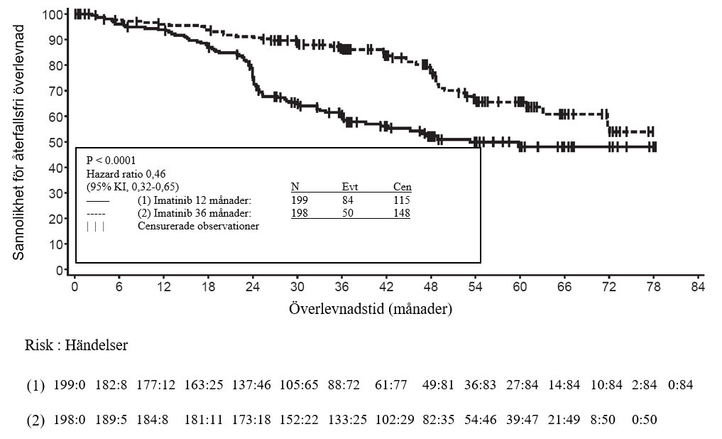 Trettiosex (36) månaders behandling med imatinib förlängde signifikant RFS jämfört med 12 månaders behandling med imatinib (hazard ratio (HR) = 0,46 [0,32-0,65], p<0,0001) (Tabell 8, Figur 1).