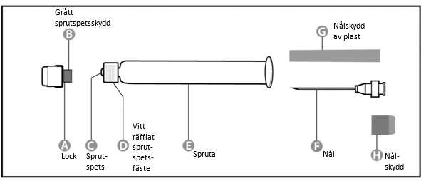 Förvara injektionsflaska och spruta i ytterkartongen. Ljuskänsligt.