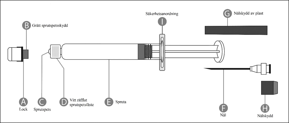 eller ett genomskinligt skruvlock (polypropen), en gummipropp (isopren-bromobutyl) och ett sprutspetsskydd (isopren-bromobutyl).