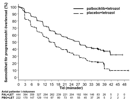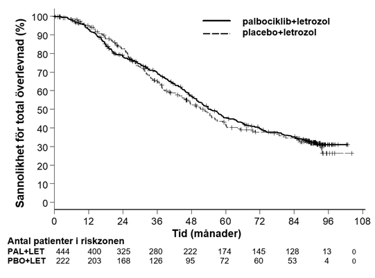 Efter en median uppföljningstid på 45 månader utfördes den slutliga OS-analysen baserat på 310 händelser (60 % av de randomiserade patienterna). En skillnad på 6,9 månader i median OS observerades i armen som fick palbociklib plus fulvestrant jämfört med armen som fick placebo plus fulvestrant. Detta resultat var inte statistiskt signifikant vid den förspecificerade signifikansnivån på 0,0235 (1-sidig). I armen som fick placebo plus fulvestrant fick 15,5 % av de randomiserade patienterna palbociklib och andra CDK-hämmare som efterföljande behandlingar efter progression.