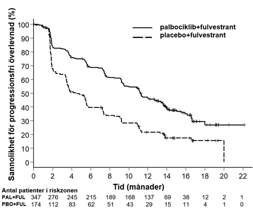 Total 521 pre-, peri- och postmenopausala kvinnor med sjukdomsprogression vid eller inom 12 månader från avslutad adjuvant endokrin behandling, eller vid eller inom 1 månad efter tidigare endokrin behandling av avancerad sjukdom, randomiserades 2:1 till palbociklib plus fulvestrant eller placebo plus fulvestrant.