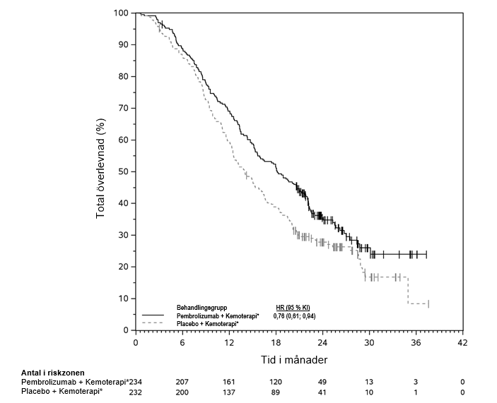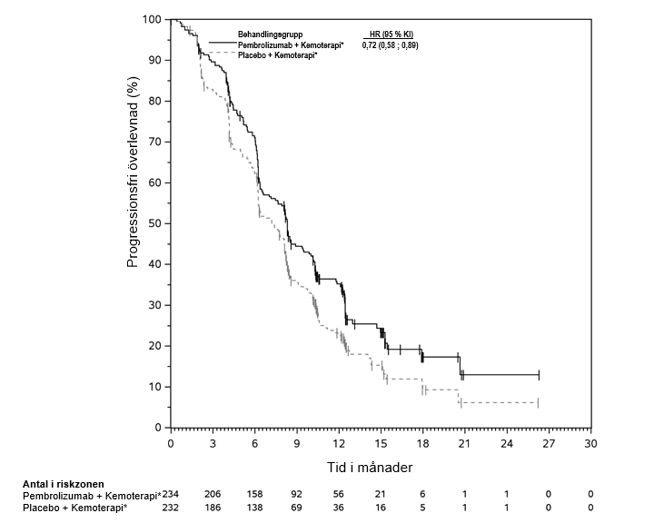 Det primära effektmåttet var OS och de sekundära effektmåtten var PFS, ORR och DoR bedömt vid BCIR enligt RECIST 1.1. Studien visade en statistiskt signifikant förbättring i OS vid finala analysen för patienter randomiserade till pembrolizumab i kombination med kemoterapi i jämförelse med placebo i kombination med kemoterapi. Tabell 54 sammanfattar de viktigaste effektmåtten och Bild 58 och 59 visar Kaplan-Meier-kurvor för PFS och OS baserat på den finala analysen med en medianuppföljningstid på 11,6 månader (intervall: 0,2 till 37,5 månader).