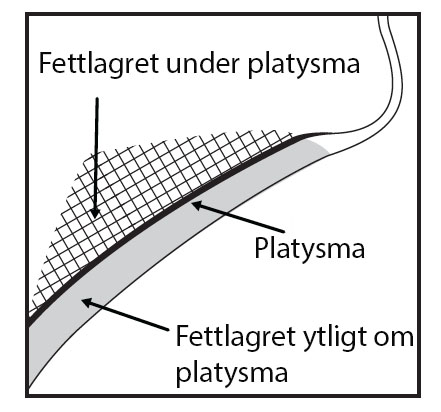 Undvik injektion i platysma. Före varje behandlingstillfälle ska det submentala behandlingsområdet palperas för att kontrollera att det finns tillräckligt mycket submentalt fett, och för att identifiera det subkutana fettet mellan dermis och platysma (fettlagret ytligt om platysma) inom det önskade behandlingsområdet (bild 2).