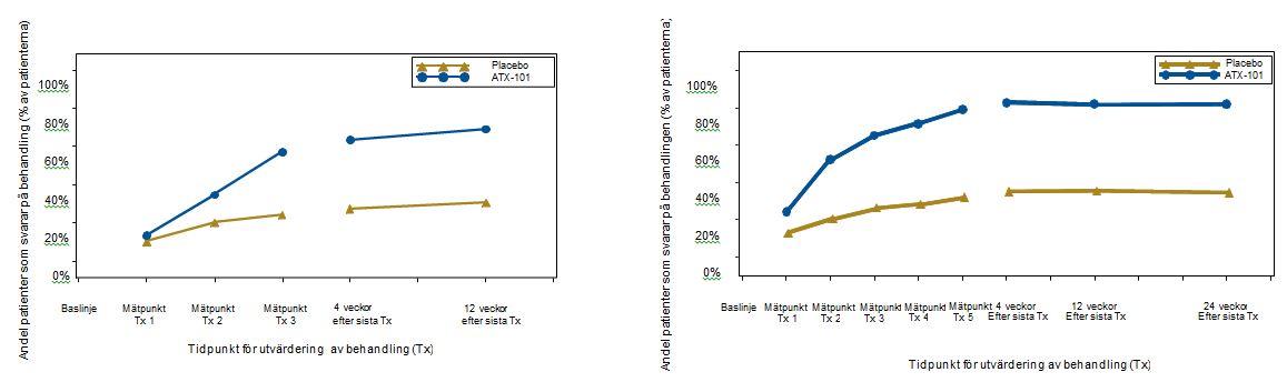 Tabell 1 nedan visar förbättringar av 1-gradig läkarrespons (CR-SMFRS), patientnöjdhet (SSRS) och psykologisk inverkan (PR-SMFIS) i alla fyra fas 3-studier. Bild 4 visar svarsfrekvenser baserat på läkares SMF-skattningar vid varje klinikbesök.