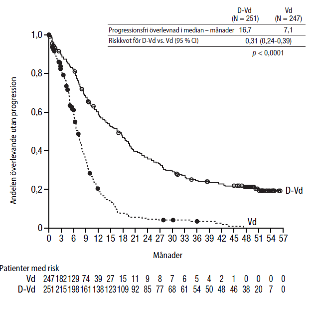Med en medianuppföljningstid på 7,4 månader visade den primära analysen av PFS i studie MMY3004 en förbättring i DVd-armen jämfört med Vd-armen; medianen för PFS hade inte uppnåtts i DVd-armen och var 7,2 månader i Vd-armen (HR [95 % CI]: 0,39 [0,28; 0,53]; p‑värde < 0,0001). Resultat från en uppdaterad PFS-analys efter en medianuppföljningstid på 50 månader fortsatte att visa en förbättring av PFS för patienter i DVd-armen jämfört med Vd-armen. Medianen för PFS var 16,7 månader i DVd-armen och 7,1 månader i Vd-armen (HR [95 % CI]: 0,31 [0,24; 0,39]; p‑värde < 0,0001), motsvarande 69 % minskad risk för sjukdomsprogression eller död hos patienter behandlade med DVd jämfört med Vd (se figur 8).