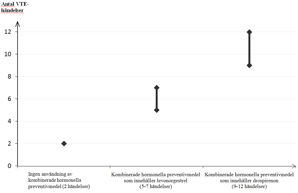 1Genomsnittsintervallet är på 5‑7 per 10 000 kvinnoår, baserat på en relativ risk för kombinerade hormonella preventivmedel som innehåller levonorgestrel jämfört med en icke‑användning på cirka 2,3 till 3,6