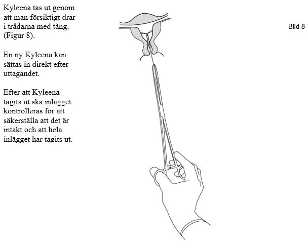 Användning av överdriven kraft/vassa instrument under uttagandet kan skada inlägget (se avsnitt 4.2). Efter att Kyleena har tagits ut ska inlägget kontrolleras för att säkerställa att det är intakt och att hela inlägget har tagits ut.