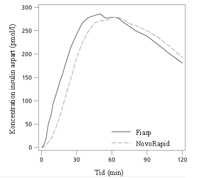 Fiasp är en måltidsinsulinformulering med insulin aspart, där tillsats av nikotinamid (vitamin B3) resulterar i en snabbare initial absorption av insulin. Insulin förekom i cirkulationen cirka 4 minuter efter administrering (Figur 1). Förekomst påvisades dubbelt så snabbt (motsvarande 5 minuter tidigare), tiden till 50% maximal koncentration var 9 minuter kortare med Fiasp jämfört med NovoRapid, med fyra gånger så mycket insulin tillgängligt under de första 15 minuterna och med dubbelt så mycket insulin tillgängligt under de första 30 minuterna.