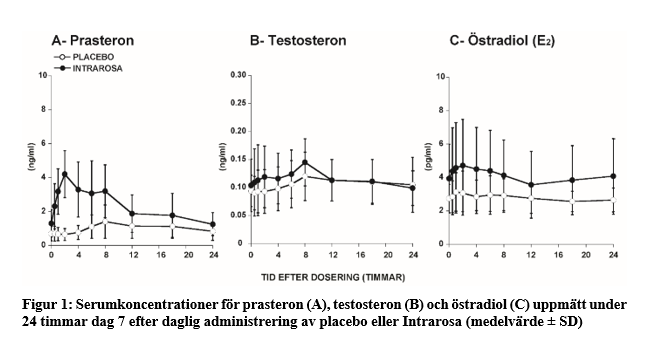 I en studie på postmenopausala kvinnor resulterade administrering av Intrarosa vagitorium en gång dagligen i 7 dagar i en genomsnittlig Cmax på 4,4 ng/ml och en area under kurvan från timme 0 till 24 (AUC0–24) på 56,2 ng•h/ml för prasteron dag 7. Detta var signifikant högre än motsvarande värden i placebogruppen (tabell 4och figur 1). Cmax och AUC0-24 för metaboliterna testosteron och östradiol var också något högre hos kvinnor som behandlades med Intrarosa vagitorier än hos kvinnor som fick placebo. Dock låg samtliga värden inom normalgränserna för postmenopausala kvinnor (< 10 pg östradiol/ml; < 0,26 ng testosteron/ml), uppmätt med validerade masspektrometrianalyser för både studieprover och referenser.