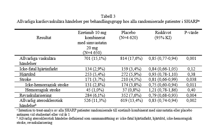 Den i studie-protokollet specificerade primära jämförelsen i SHARP var en intention to treat-analys av allvarliga vaskulära händelser (allvarliga vaskulära händelser definierat som icke-fatal hjärtinfarkt eller hjärtdöd, stroke eller revaskulariseringsingrepp) endast hos de patienter som initialt randomiserades till ezetimib kombinerat med simvastatin (n=4 193) eller till placebogrupperna (n=4 191). Sekundära analyser inkluderade samma komposit-mått analyserad i hela kohorten som randomiserades (vid studiestart eller vid år 1) till ezetimib kombinerat med simvastatin (n=4 650) eller placebo (n=4 620) samt analys av delkomponenterna av det sammansatta effektmåttet.