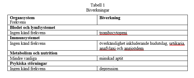 Frekvensen definieras som: mycket vanliga (≥1/10); vanliga (≥1/100, <1/10); mindre vanliga (≥1/1 000, <1/100); sällsynta (≥1/10 000, <1/1 000), mycket sällsynta (<1/10 000) och ingen känd frekvens (kan inte beräknas från tillgängliga data).