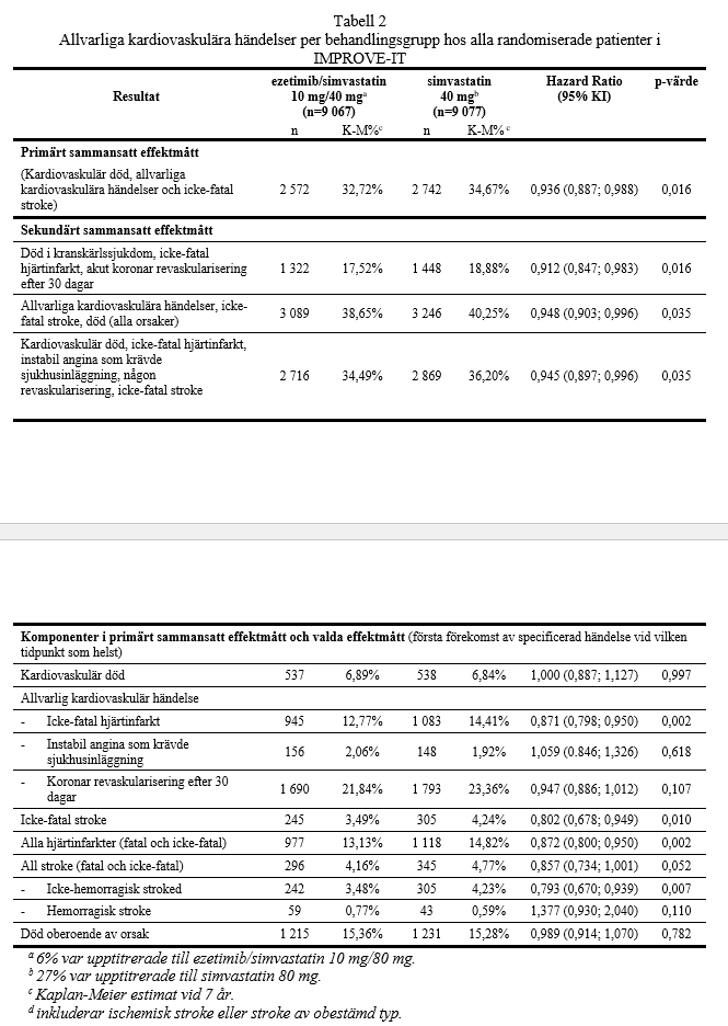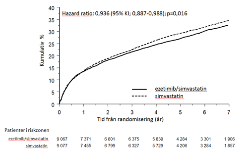 Det primära effektmåttet var sammansatt och bestod av kardiovaskulär död, allvarliga kardiovaskulära händelser (definierade som icke-fatal hjärtinfarkt, dokumenterad instabil angina som krävde sjukhusinläggning eller koronar revaskularisering minst 30 dagar efter randomisering) och icke-fatal stroke. Studien visade positiv effekt av kombinationsbehandling med ezetimib/simvastatin på det primära effektmåttet sammansatt av kardiovaskulär död, allvarliga kardiovaskulära händelser och icke-fatal stroke jämfört med behandling med enbart simvastatin (relativ riskreduktion på 6,4%, p=0,016). Det primära effektmåttet inträffade hos 2 572 av 9 067 patienter (7 års Kaplan-Meier [KM]-värde 32,72%) i ezetimib/simvastatingruppen och 2 742 av 9 077 patienter (7 års KM-värde 34,67%) i gruppen med enbart simvastatin. (Se bild 1 och tabell 2.) Denna positiva effekt gentemot behandling med enbart statiner, förväntas vara likvärdig vid kombinationsbehandling med andra statiner som visats sig effektiva för att minska risken för kardiovaskulära händelser. Total mortalitet var oförändrad i denna högriskgrupp (se tabell 2).