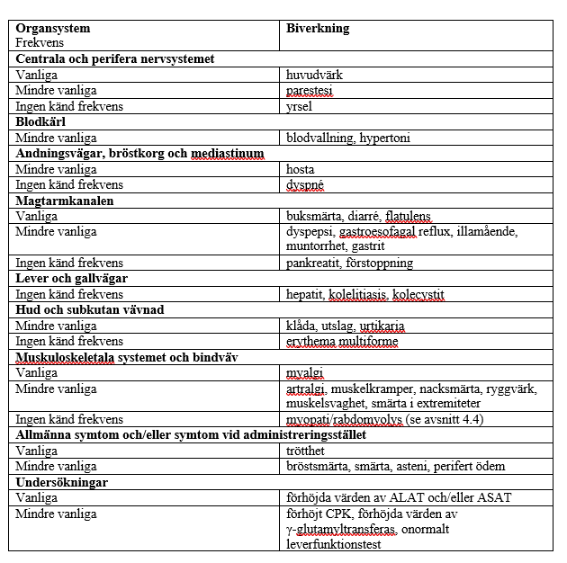 Följande biverkningar observerades hos patienter som fick ezetimib ensamt (n=2 396) och förekom i större utsträckning än hos patienter som fick placebo (n=1 159) eller hos patienter som fick ezetimib tillsammans med en statin (n=11 308) och förekom i större utsträckning än hos patienter som fick en statin ensamt (n=9 361). Biverkningar efter godkännandet av läkemedlet erhölls från rapporter om ezetimib givet antingen ensamt eller tillsammans med en statin. Biverkningar som observerats i kliniska studier av ezetimib (som monoterapi eller samtidigt administrerat med statin) eller ezetimib som rapporterats från användning efter marknadsföring antingen administrerat ensamt eller tillsammans med statin anges i tabell 1. Dessa reaktioner presenteras efter organklass och efter frekvens.