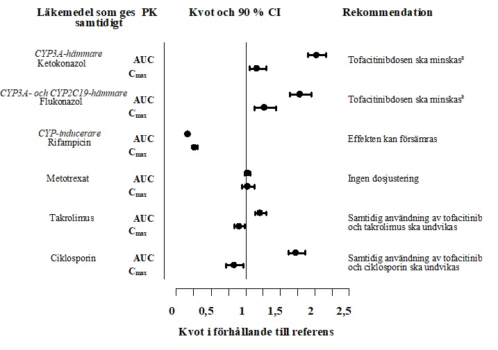 Tofacitinib är inte en hämmare eller inducerare av CYP (CYP1A2, CYP2B6, CYP2C8, CYP2C9, CYP2C19, CYP2D6 eller CYP3A4) och är inte en hämmare av UGT (UGT1A1, UGT1A4, UGT1A6, UGT1A9 eller UGT2B7). Tofacitinib är inte en hämmare av MDR1, OATP1B1/1B3, OCT2, OAT1/3 eller MRP vid kliniskt meningsfulla koncentrationer.