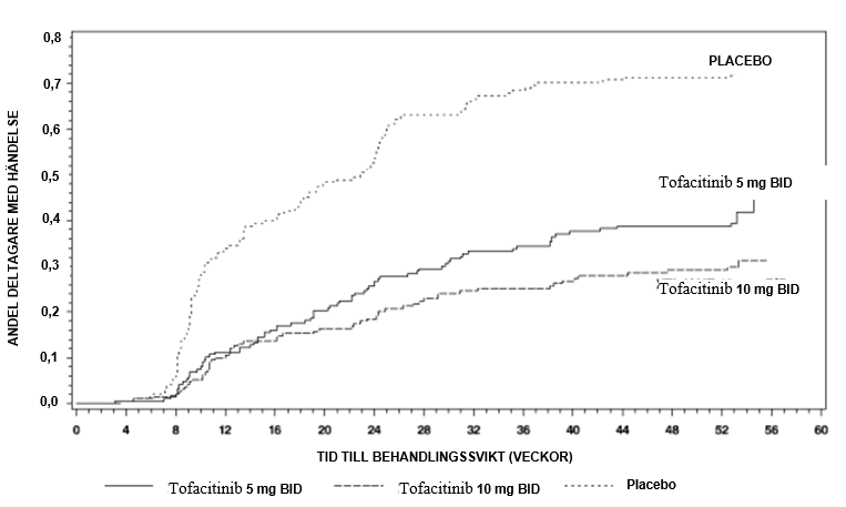 Andelen patienter i båda tofacitinib-grupperna med behandlingssvikt var färre jämfört med placebo vid varje tidpunkt redan vecka 8, den första tid då behandlingssvikt bedömdes, se figur 2.