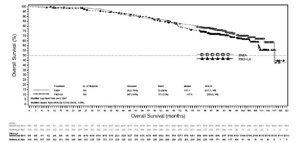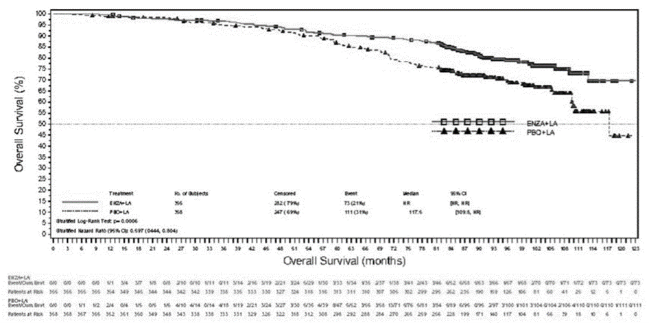 En slutlig analys av 5‑årsdata från PREVAIL visade att en statistiskt signifikant ökning av den totala överlevnaden upprätthölls hos patienter som behandlades med enzalutamid jämfört med placebo [HR = 0,835 (95 % KI: 0,75, 0,93), p‑värde = 0,0008] trots att 28 % av patienterna på placebo bytte till enzalutamid. Den totala 5-årsöverlevnaden var 26 % i enzalutamidgruppen jämfört med 21 % i placebogruppen.