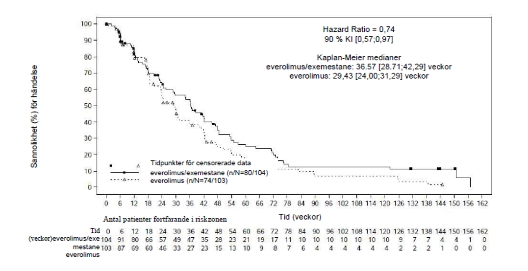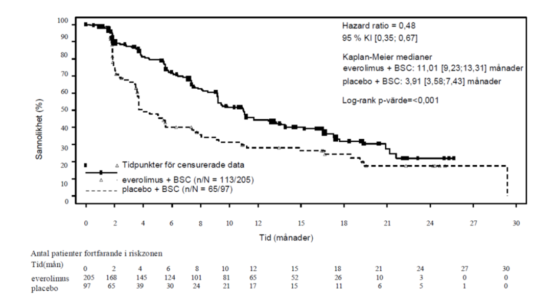 Mediantiden för blindad behandling i studien var 9,6 månader (intervall: 5,5 till 18,1) för de patienter som fick everolimus och 8,3 månader (intervall: 3,2 till 18,3) för de som fick placebo.