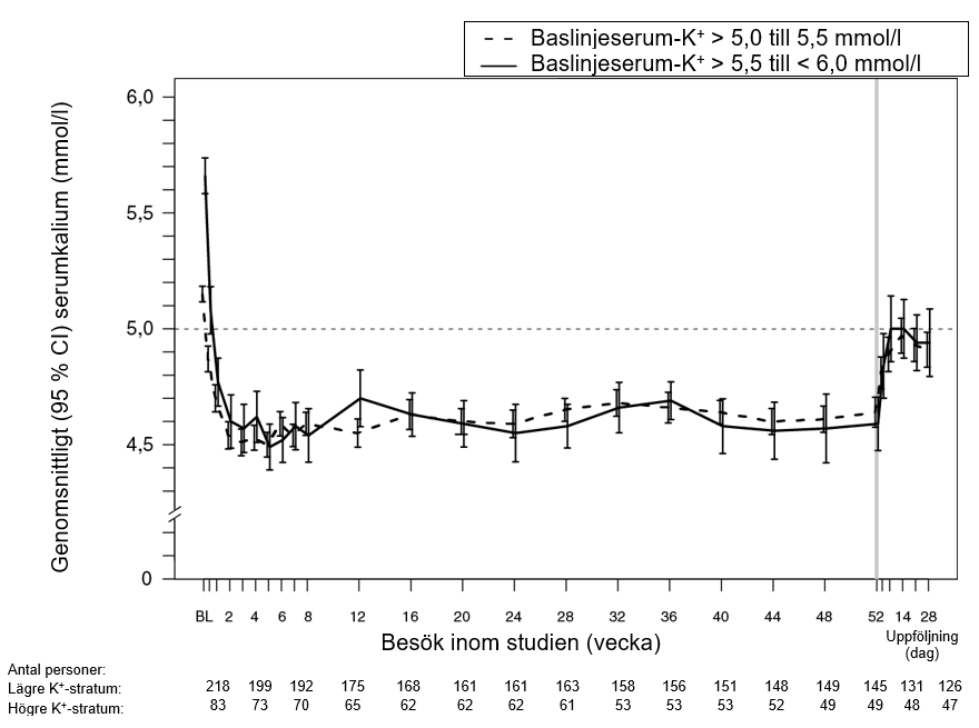 Genomsnittliga serumkaliumnivåer och förändring i serumkalium från del A-baslinje till del A, vecka 4 visas i tabell 1. För del A, sekundärt utfall hade 76 % (95 % CI: 70 %, 81 %) av patienterna ett serumkalium inom målintervallet 3,8 mmol/l till < 5,1 mmol/l vid del A, vecka 4.