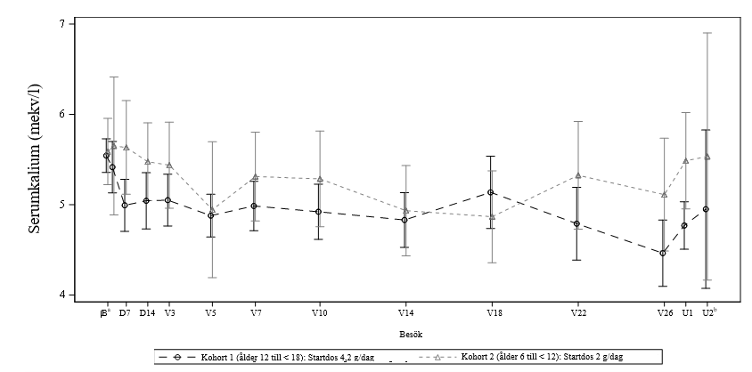 Sammantaget fullbordade 23 patienter (14 patienter i åldern 12 till < 18 år och 9 patienter i åldern 6 till < 12 år) dossökningsfasen och 21 patienter (12 patienter i åldern 12 till < 18 år och 9 patienter i åldern 6 till < 12 år) LT-behandlingsfasen. Ingen patient avbröt studien på grund av säkerhetsproblem. Det primära effektmåttet för denna studie var förändring från baslinjen i serumkaliumnivåer vid dag 14. I båda åldersgrupperna observerades en minskning av kaliumnivåerna på dag 14: genomsnittlig (SD) kaliumförändring från baslinjen var -0,50 (0,542) mekv/l i 12 till < 18 års ålder och -0,14 (0,553) mekv/l i 6 till <12 års ålder) och bibehölls under hela studien under behandling (figur 2).