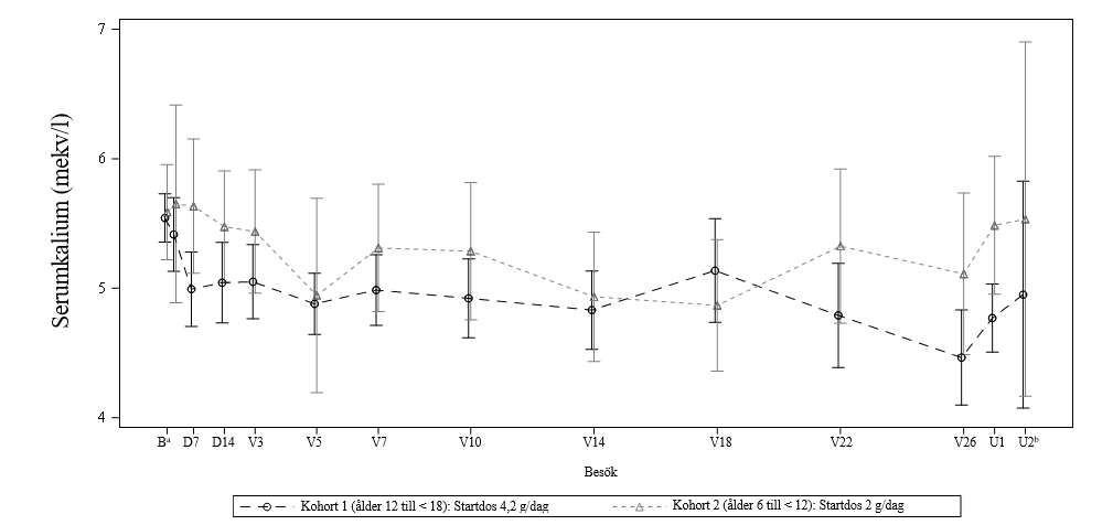 Sammantaget fullbordade 23 patienter (14 patienter i åldern 12 till < 18 år och 9 patienter i åldern 6 till < 12 år) dossökningsfasen och 21 patienter (12 patienter i åldern 12 till < 18 år och 9 patienter i åldern 6 till < 12 år) LT-behandlingsfasen. Ingen patient avbröt studien på grund av säkerhetsproblem. Det primära effektmåttet för denna studie var förändring från baslinjen i serumkaliumnivåer vid dag 14. I båda åldersgrupperna observerades en minskning av kaliumnivåerna på dag 14: genomsnittlig (SD) kaliumförändring från baslinjen var -0,50 (0,542) mekv/l i 12 till < 18 års ålder och -0,14 (0,553) mekv/l i 6 till <12 års ålder) och bibehölls under hela studien under behandling (figur 2).