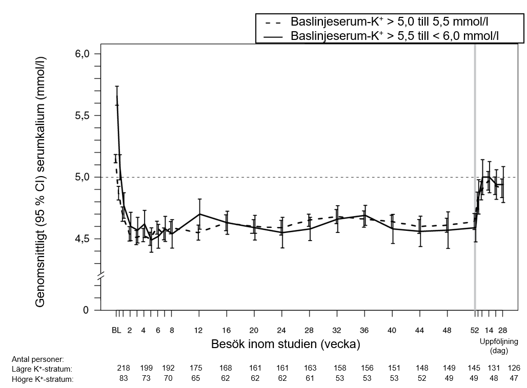 Genomsnittliga serumkaliumnivåer och förändring i serumkalium från del A-baslinje till del A, vecka 4 visas i tabell 1. För del A, sekundärt utfall hade 76 % (95 % CI: 70 %, 81 %) av patienterna ett serumkalium inom målintervallet 3,8 mmol/l till < 5,1 mmol/l vid del A, vecka 4.