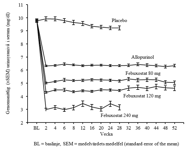 Andelen patienter med urinsyranivå i serum <6,0 mg/dl (357 mikromol/l) vid sista besöket var större än 80% (81-100%) vid varje febuxostatdos.