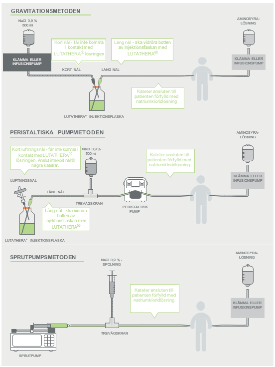 Vid användning av gravitationsmetoden eller den peristaltiska pumpmetoden ska Lutathera infuseras direkt från originalbehållaren. Den peristaltiska pumpmetoden eller sprutpumpsmetoden ska användas vid administrering av en reducerad dos av Lutathera efter dosändring vid en biverkning (se tabell 3 i avsnitt 4.2). Att använda gravitationsmetoden för att administrera en reducerad dos av Lutathera kan resultera i infusion av fel mängd Lutathera om dosen inte justeras före administrering. Försiktighetsåtgärder avseende strålsäkerhet måste övervägas oavsett vilken administreringsmetod som används (se avsnitt 6.6).