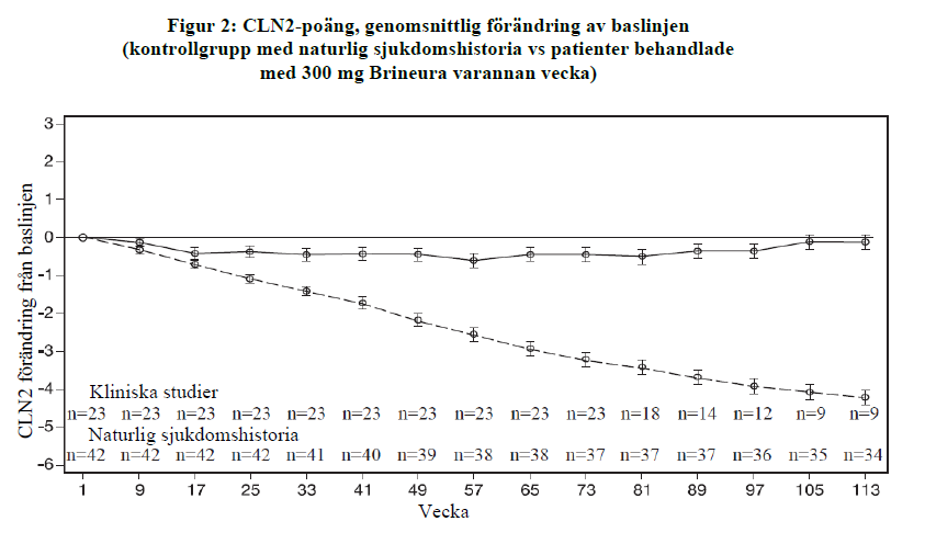 Säkerheten och effekten av Brineura bedömdes i den öppna, doseskalerande kliniska studien 190-201 och den pågående långvariga förlängningsstudien 190-202 i patienter med sjukdomen CLN2 jämfört med obehandlade patienter med sjukdomen CLN2, från en databas med naturlig sjukdomshistoria (kontrollgrupp med naturlig sjukdomshistoria). Dessa studier använde summan av domänerna för motorik och språk från en sjukdomsspecifik klinisk bedömningsskala (se tabell 3) för att bedöma sjukdomsprogressionen. Varje område omfattar poäng från 3 (i stort sett normal) till 0 (grav funktionsnedsättning), för ett totalt möjligt poäng på 6 med enhetsminskningar som representerar en viktig händelse i förlusten av tidigare funktionsnivåer för rörlighet och tal.