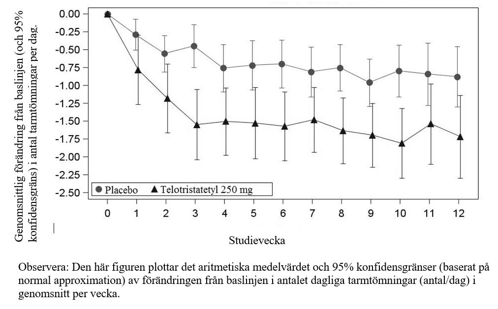 Genomsnittliga veckovisa minskningar av tarmtömningsfrekvensen observerades för telotristat så tidigt som vid 3 veckor i den 12 veckor långa dubbelblinda behandlingsperioden av studien, där de kraftigaste minskningarna inträffade under de sista 6 veckorna i den dubbelblindade behandlingsperioden jämfört med placebo (se Figur 1).