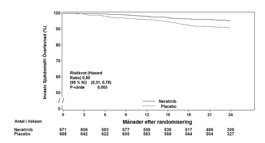 Primäranalysen av studien 2 år efter randomiseringen visade att Nerlynx signifikant minskade risken för invasivt sjukdomsrecidiv, eller dödsfall, med 33 procent (HR = 0,67 med 95 procent KI (0,49; 0,91), tvåsidigt p = 0,011) i ITT-populationen.