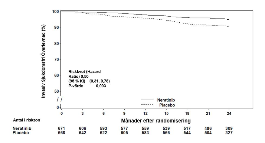 Primäranalysen av studien 2 år efter randomiseringen visade att Nerlynx signifikant minskade risken för invasivt sjukdomsrecidiv, eller dödsfall, med 33 procent (HR = 0,67 med 95 procent KI (0,49; 0,91), tvåsidigt p = 0,011) i ITT-populationen.