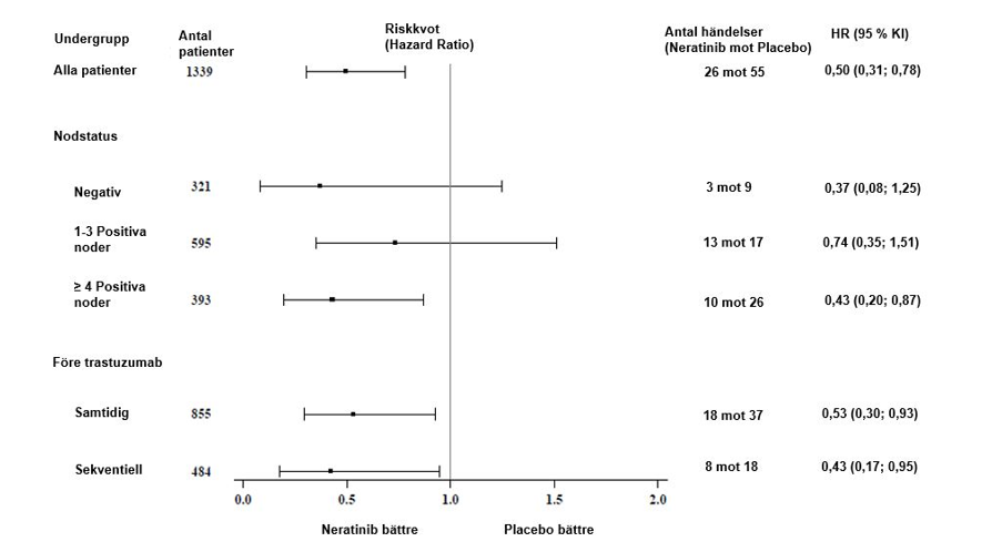 För hormonreceptorpositiva patienter som avslutade trastuzumab-behandling för mindre än ett år sedan visas den relativa behandlingsnyttan av Nerlynx inom förspecificerade patientundergrupper i figur 2.