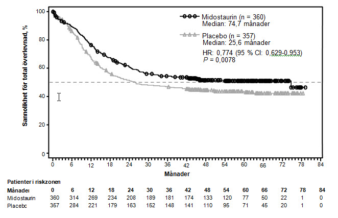 Studiens primära effektmått var total överlevnad (OS), som mättes från randomiseringsdagen fram till dödsfall oavsett orsak. Den primära analysen utfördes efter en minsta uppföljningstid på cirka 3,5 år efter att den sista patienten randomiserats. I studien sågs en statistiskt signifikant förbättring av OS med 23 % lägre risk för dödsfall för midostaurin plus standardkemoterapi än för placebo plus standardkemoterapi (se tabell 6 och figur 1).
