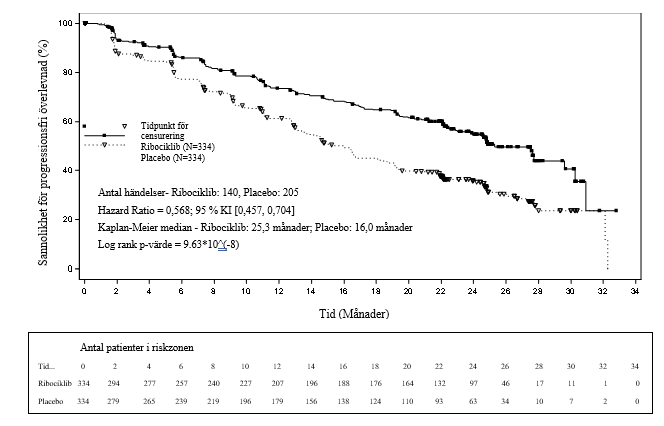 I tillägg var sannolikheten för progression på nästa behandlingslinje eller död (PFS2) lägre hos patienter som fick ribociklib i studien jämfört med placebogruppen med en riskkvot på 0,692 (95% KI: 0,548; 0,875) i den totala studiepopulationen. PFS2 var 32,3 månader i median (95% KI: 27,6; 38,3) i placebogruppen och uppnåddes inte i ribociklibgruppen (95% KI: 39,4; NE). Liknande resultat observerades hos NSAI-subgruppen med en riskkvot på 0,660 (95% KI: 0,503; 0,868) och PFS2 på 32,3 månader i median i placebogruppen (95% KI: 26,9; 38,3) versus ej uppnådd i ribociklibgruppen (95% KI: 39,4; NE).