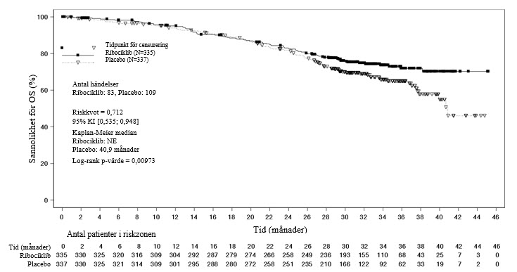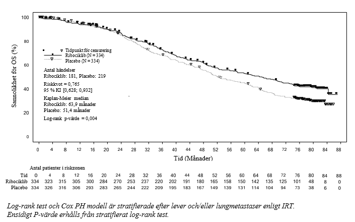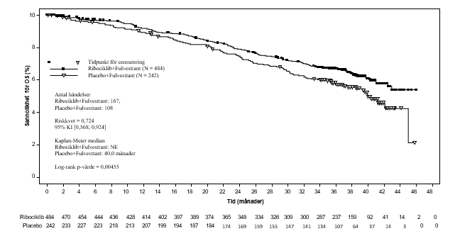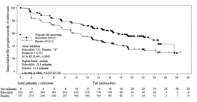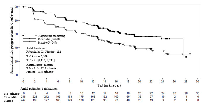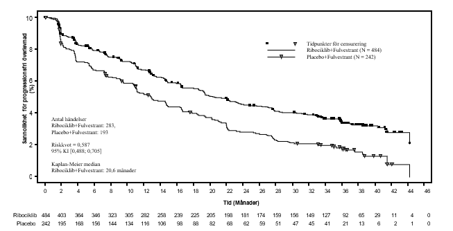 Resultaten visade på en statistiskt signifikant förbättring av PFS hos patienter som fick Kisqali plus fulvestrant jämfört med hos patienter som fick placebo plus fulvestrant i hela analyspopulationen (riskkvot 0,593, 95 % KI: 0,480; 0,732, p-värde med ensidigt stratifierat logrank-test 4,1 x 10-7) med beräknad minskning av den relativa risken för progression eller död på 41 % till fördel för gruppen som fick Kisqali plus fulvestrant.