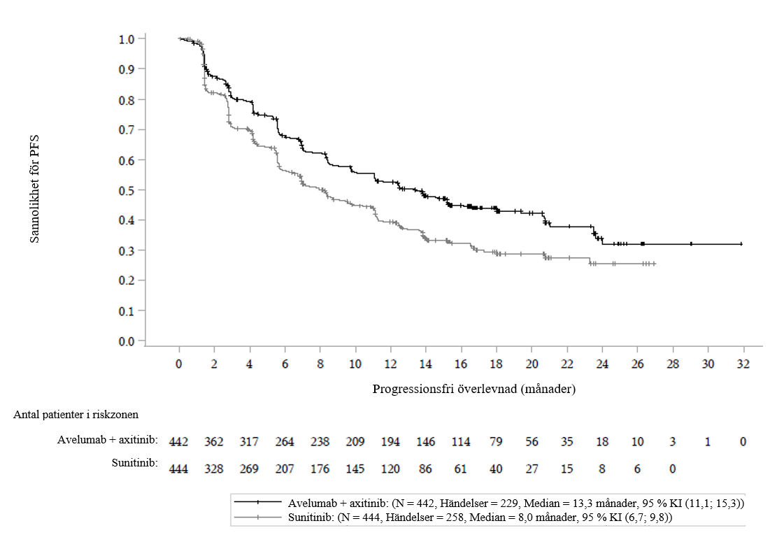 Behandling med avelumab och axitinib fortgick fram till RECIST v1.1‑definierad sjukdomsprogression bedömd genom blindad, oberoende central granskning (BICR) eller oacceptabel toxicitet. Administrering av avelumab och axitinib tilläts efter RECIST‑definierad sjukdomsprogression på basis av prövarens bedömning av patientens nytta-risk och kliniska tillstånd, omfattande performance status, kliniska symtom, biverkningar och laboratoriedata. De flesta patienterna (n=160, 71,4 %) med progressiv sjukdom fortsatte med behandling med båda läkemedlen efter progression. Bedömning av tumörstatus genomfördes vid baseline, efter randomisering i vecka 6, därefter var 6:e vecka upp till 18 månader efter randomisering, och därefter var 12:e vecka fram till dokumenterad bekräftad sjukdomsprogression enligt BICR.