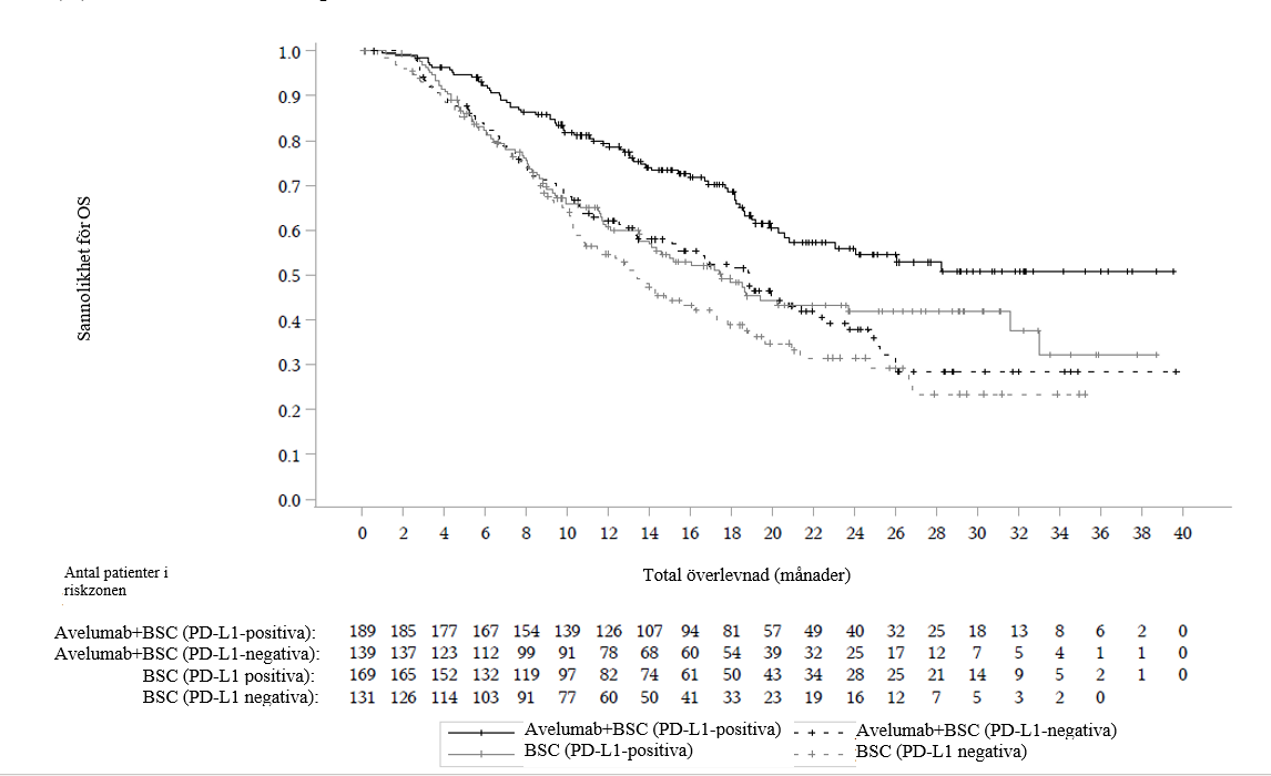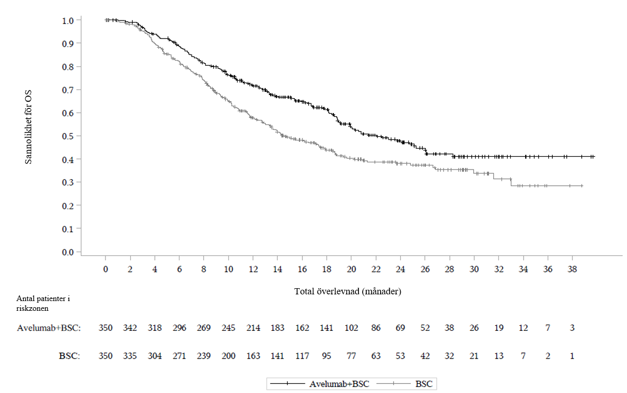 Vid den förspecificerade interimanalysen (brytdatum 21 oktober 2019) uppfyllde studie B9991001 det primära effektmåttet för OS i både koprimära populationerna: hos alla randomiserade patienter med en median OS på 21,4 månader (95 % KI: 18,9, 26,1; HR 0,69, 95 % KI: 0,556, 0,863) i gruppen som fick avelumab plus BSC och med en median OS på 14,3 månader (95 % KI: 12,9, 17,8) hos gruppen som fick enbart BSC. För patienter med PD‑L1-positiva tumörer uppnåddes inte median OS (95 % KI: 20,3; HR 0,56, 95 %, KI: 0,404, 0,787) i gruppen som fick avelumab plus BSC och median OS hos gruppen som fick enbart BSC var 17,1 månader (95 % KI: 13,5, 23,7). Uppdaterade OS-resultat med brytpunkt den 19 januari 2020 och PFS-data med brytpunkt 21 oktober 2019 presenteras i tabell 8 samt i figur 3 och figur 4 nedan.
