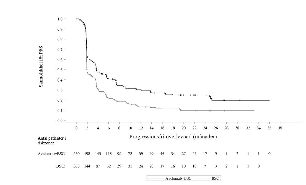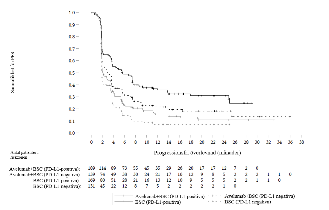 Obs! 72 patienter (22 patienter i gruppen på avelumab plus BSC och 50 patienter på enbart BSC) hade en tumör med en okänd PD‑L1-status.