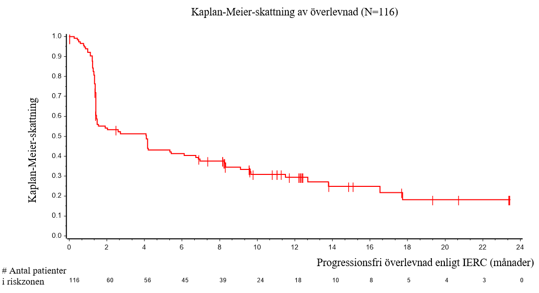 I denna studie fanns ingen komplett respons (CR) eller partiell respons (PR) bedömd i enlighet med RECIST 1.1.