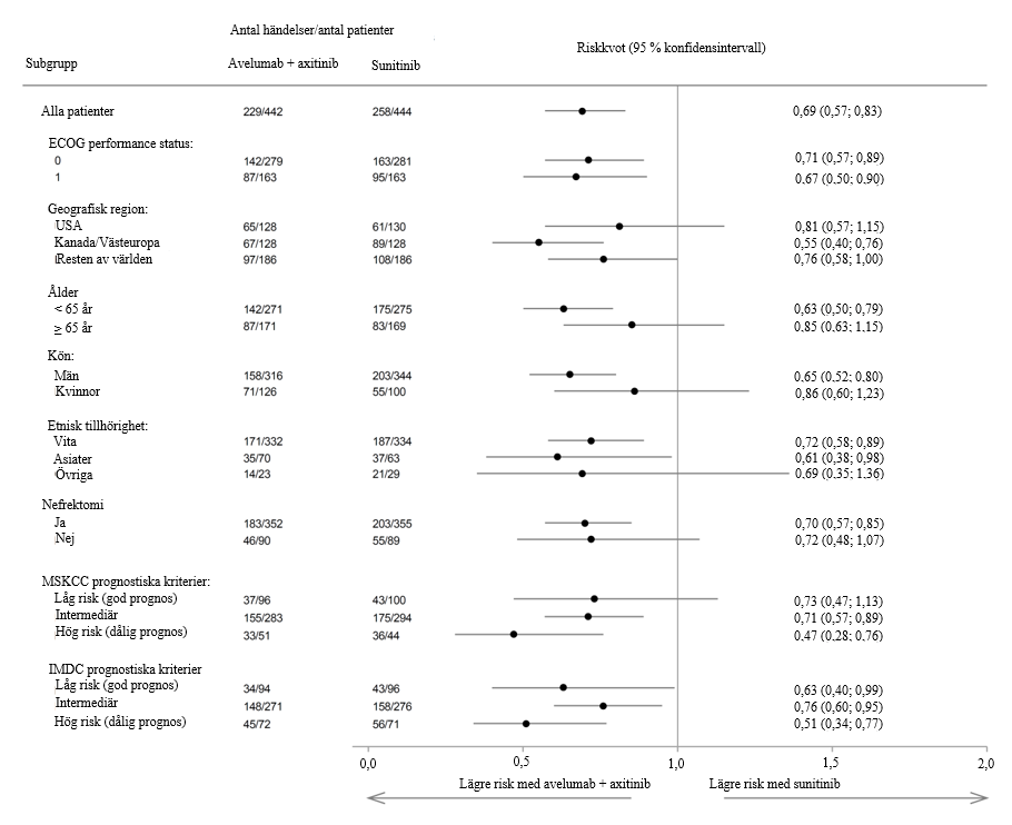 Effektresultaten redovisas i tabell 9 och figur 5 baserat på data vid tidpunkten då datainsamlingen upphörde den 28 januari 2019. Med en medianuppföljning av OS på 19 månader var OS-data omogna med 27 % dödsfall. Den observerade riskkvoten (HR) för OS var 0,80 (95 % KI: 0,616; 1,027) för avelumab i kombination med axitinib jämfört med sunitinib.