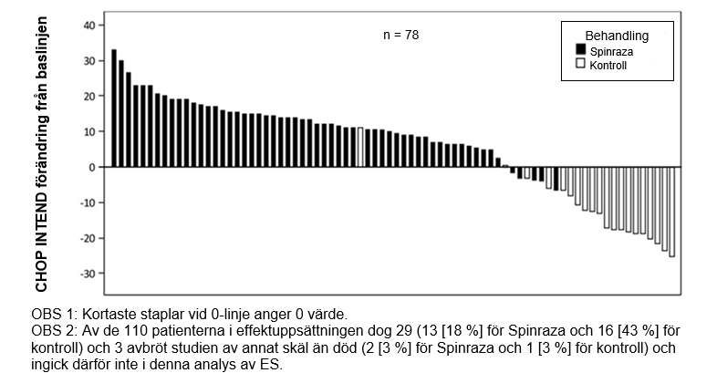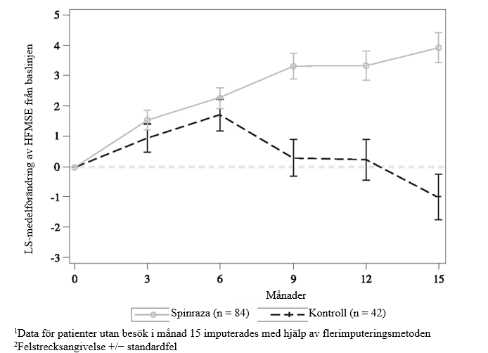 I den slutliga analysen sågs en statistiskt signifikant förbättring i poäng från baslinjen till månad 15 enligt HFMSE-skalan (Hammersmith Functional Motor Scale Expanded) för Spinraza-behandlingsgruppen jämfört med simuleringskontrollgruppen (tabell 4, figur 2). Analysen genomfördes på ITT-populationen (Spinraza: n=84; simuleringskontroll: n=42) och data efter baslinjen enligt HFMSE-skalan för patienter som inte genomfört besök månad 15 imputerades med hjälp av flerimputeringsmetoden. En analys av undergruppen med patienter i ITT-populationen som hade observerade värden vid månad 15 uppvisade överensstämmande, statistiskt signifikanta resultat. För dem med observerade värden vid månad 15 hade en högre andel patienter som behandlades med Spinraza en förbättring (73 % kontra 41 %) och en lägre andel patienter som behandlades med Spinraza en försämring (23 % kontra 44 %) i totalpoäng enligt HFMSE-skalan jämfört med simuleringskontrollgruppen. Sekundära effektmått inklusive funktionsmätningar och prestation i motorisk milstolpe enligt WHO testades statistiskt och beskrivs i tabell 4.
