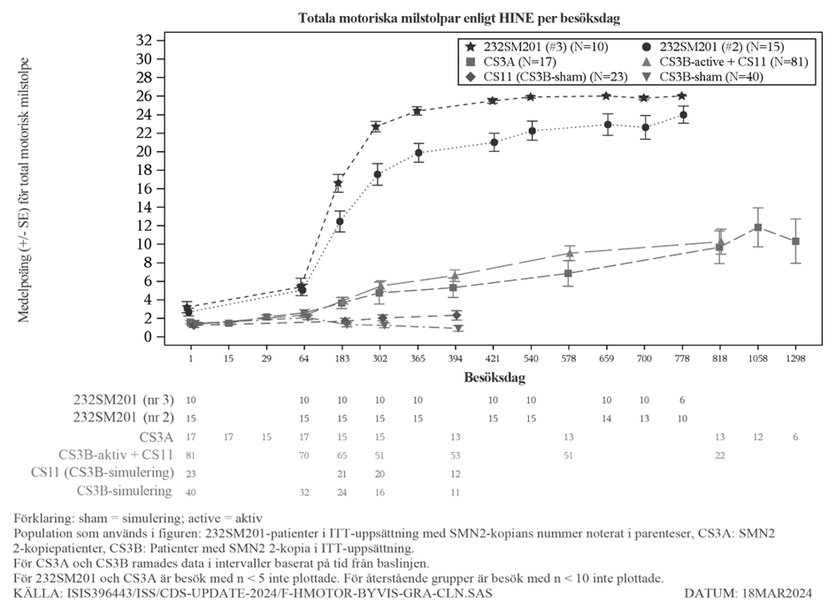 Förbättringar i motoriska funktioner observerades bland patienter som fortsatte med Spinraza från studie CS3B, samt hos dem som inledde Spinraza-behandling i studie CS11 (bild 3). Den största nyttan observerades hos dem som inledde behandling tidigare. Majoriteten av patienterna var vid liv vid sitt sista besök efter att de inlett behandling med Spinraza i antingen studie CS3B eller studie CS11.