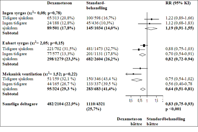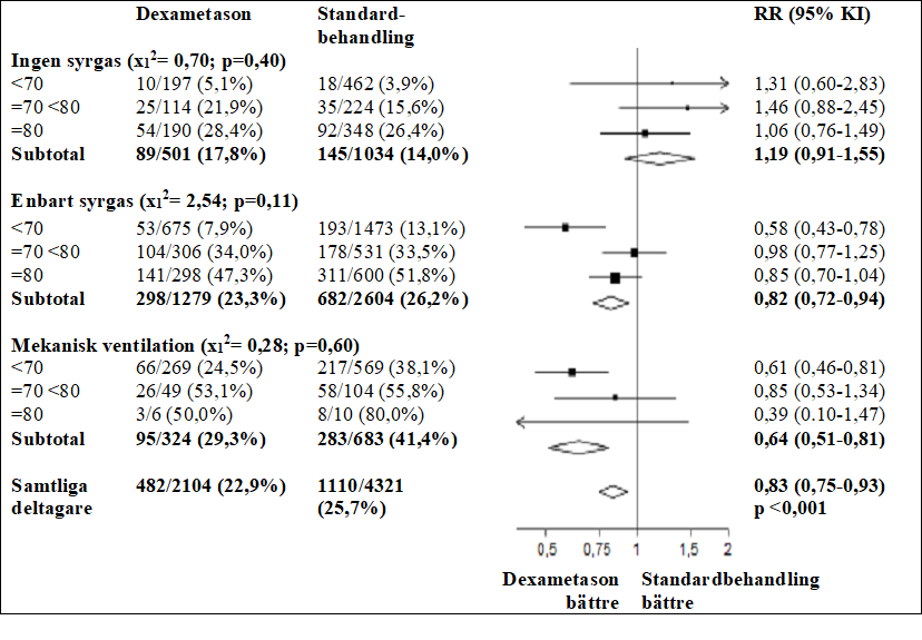 I dexametasongruppen var incidensen av dödsfall lägre än hos gruppen som fick standardbehandling för de patienter i dexametasongruppen som fick invasiv mekanisk ventilation (29,3 % vs. 41,4 %; frekvenskvot, 0,64; 95 % KI, 0,51 till 0,81) samt hos de som fick syrgasbehandling utan invasiv mekanisk ventilation) (23,3 % vs. 26,2 %; frekvenskvot, 0,82; 95 % KI, 0,72 till 0,94).