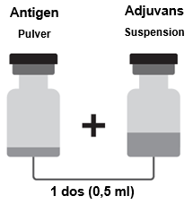 Shingrix tillhandahålls i en injektionsflaska med ett brunt snäpplock som innehåller pulvret (antigen) och en injektionsflaska med ett blågrönt snäpplock som innehåller suspensionen (adjuvans).