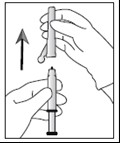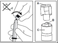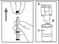 Håll sprutan upprätt i den räfflade delen (C). Ta med andra handen tag i locket (A) och vicka försiktigt fram och tillbaka tills locket lossnar och kan tas av, men vrid inte (se Bild 1).