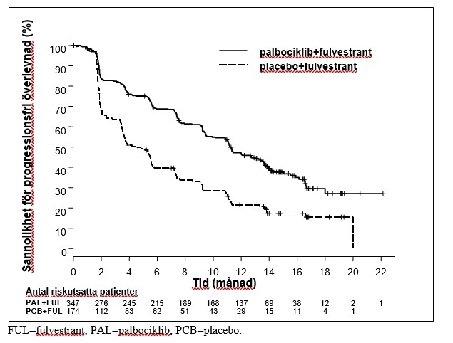 En minskad risk för sjukdomsprogression eller död i armen fulvestrant plus palbociklib observerades i alla individuella patientundergrupper definierat genom stratifieringsfaktorer och baslinjekarakteristika. Detta var tydligt hos pre/perimenopausala kvinnor (HR på 0,46 [95 % CI: 0,28, 0,75]) och postmenopausala kvinnor (HR på0,52 [95 % CI: 0,40, 0,66]) och patienter med visceral metastatisk sjukdom (HR på 0,50 [95 % CI: 0,38, 0,65]) och icke-visceral metastatisk sjukdom (HR på 0,48 [95 % CI: 0,33, 0,71]). Nyttan kunde även observeras oberoende av tidigare behandlingslinjer i det metastatiska tillståndet, om 0 (HR på 0,59 [95 % CI: 0,37, 0,93]), 1 (HR på 0,46 [95 % CI: 0,32, 0,64]), 2 (HR på 0,48 [95 % CI: 0,30, 0,76]), eller ≥3 linjer (HR på 0,59 [95 % CI: 0,28, 1,22]).