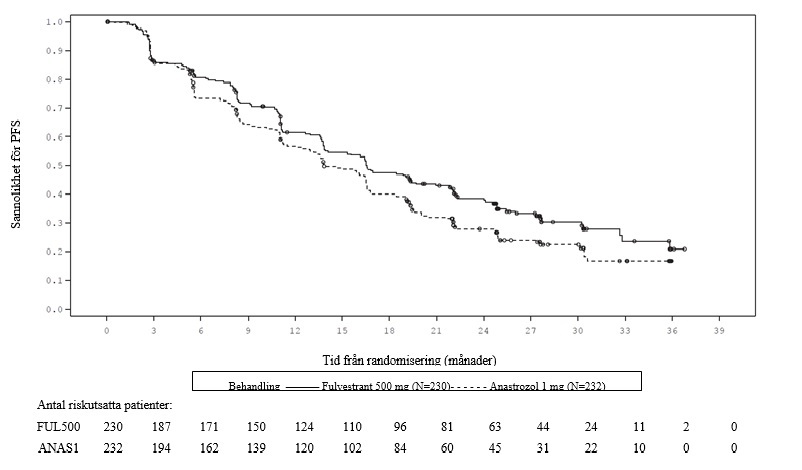 En klinisk fas 3-studie genomfördes på 736 postmenopausala kvinnor med avancerad bröstcancer som hade recidiv under pågående eller efter adjuvant endokrin terapi eller progression efter endokrin terapi för avancerad sjukdom. Studien inkluderade 423 patienter som hade recidiv efter eller progredierade under antiöstrogenbehandling (AE-subgrupp) och 313 patienter som hade recidiv efter eller progredierade under behandling med aromatashämmare (AI-subgrupp). I denna studie jämfördes effekten och säkerheten för fulvestrant 500 mg (n=362) med fulvestrant 250 mg (n=374). Progressionsfri överlevnad (PFS) var primärt effektmått. De viktigaste sekundära effektmåtten inkluderade den objektiva responsen (ORR), kliniska nyttan (CBR) och total överlevnad (OS). Effektresultat för CONFIRM-studien är summerade i tabell 3.