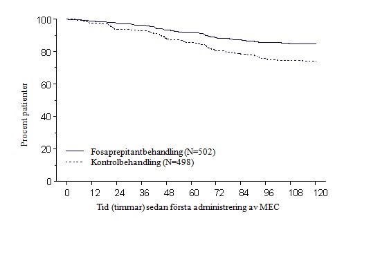 Effekten av fosaprepitant utvärderades på basis av de primära och sekundära effektmåtten som anges i tabell 2 och visades vara överlägsen kontrollbehandlingen vad avser fullständigt svar i de fördröjda och totala faserna.