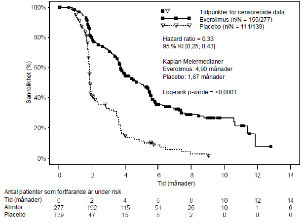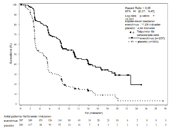 Everolimus var överlägset placebo vad avser primärt effektmått av progressionsfri överlevnad, med en statistiskt signifikant, 67 %, minskning av risken för progression eller dödsfall (se Tabell 7 och Figur 6).